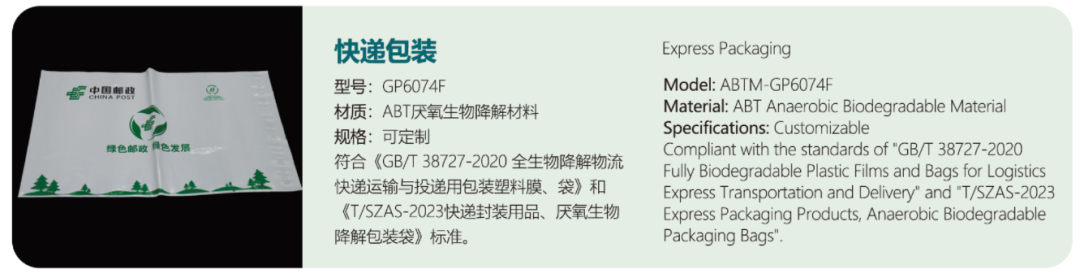 快递行业的快速发展使得传统塑料袋使用量巨大,且回收率极低。采用 ABT 降解技术生产的快递包装袋,在不影响运输性能的基础上,可在终端实现降解,助力物流企业顺利完成绿色转型。