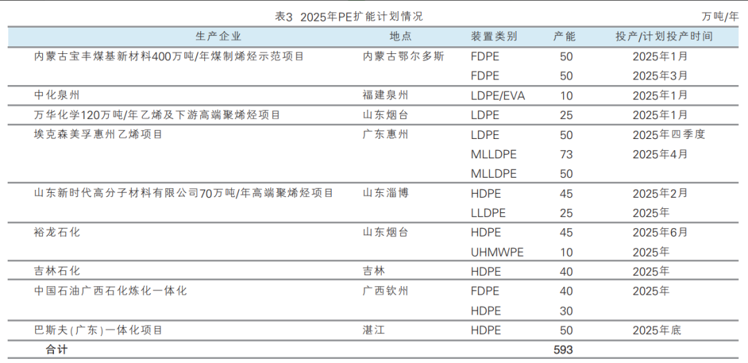截至2025年7月,国内PE装置总产能达3789万吨/年;2024—2026年PE行业依旧处于扩能高峰期。2024年国内聚乙烯新增产能为‌340万吨/年‌,产能增速达11%,总产能达到3431万吨/年‌。2025年计划新增产能达到593万吨,总产能突破了4000万吨,达到4024万吨,产能增速达到了17.3%,其中上半年已实现新增348万吨。