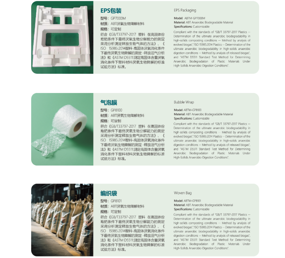 ABT厌氧生物降解技术符合GB/T 41010-2021、GB/T 33797-2017、ISO 15985和ASTM D5511等国内外降解标准!