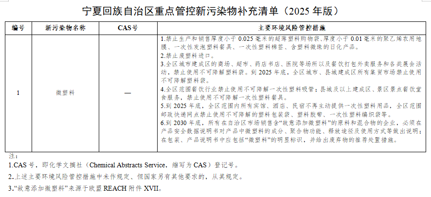 从12月1日起,宁夏将成为全国又一个向微塑料污染重拳出击的省份。根据宁夏回族自治区八部门联合印发的《宁夏回族自治区重点管控新污染物补充清单(2025年版)》,微塑料正式被纳入重点管控物质,并明确了六项关键环境风险管控措施。