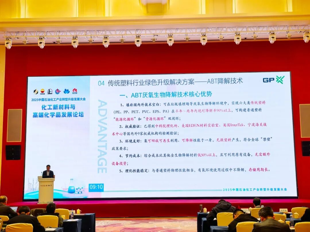 在近日举办的2025中国石油化工产业转型升级发展大会上,一场关于传统塑料行业绿色升级的创新解决方案演讲引发广泛关注。格域总裁发表的《传统塑料绿色升级的创新解决方案——ABT降解技术》主题报告,为行业提供了一条切实可行的绿色发展路径。