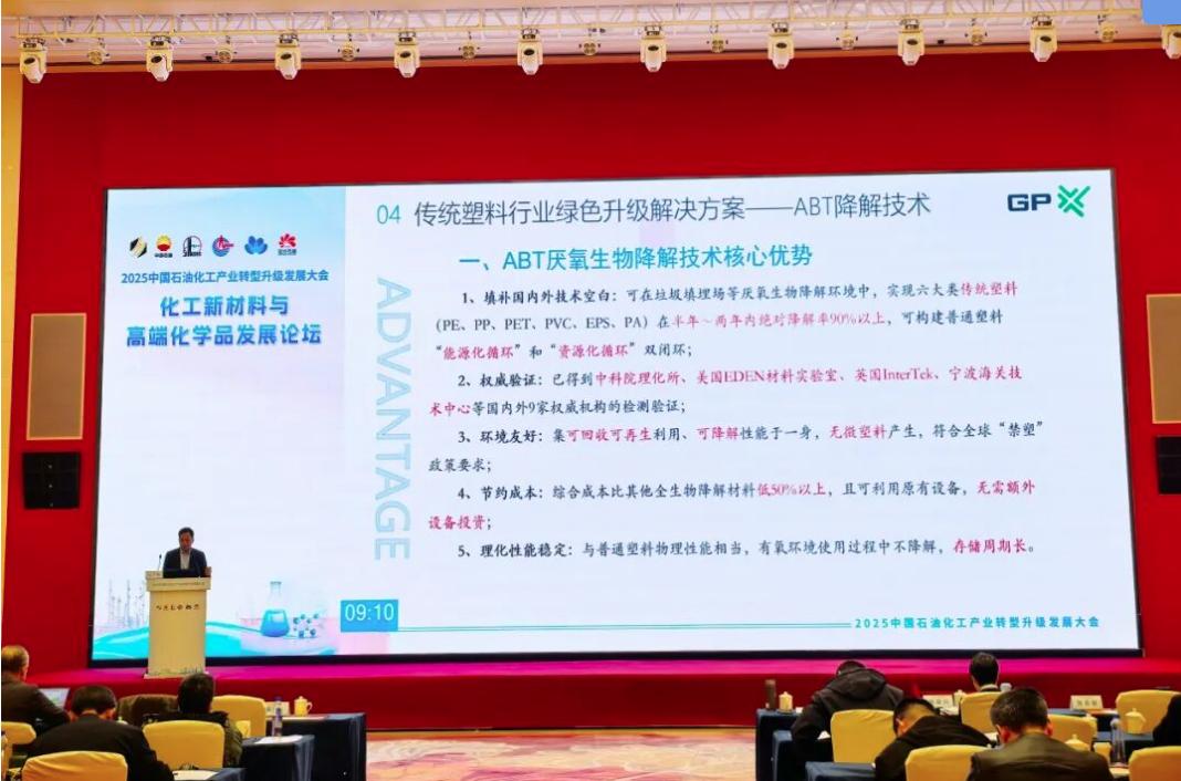 At the recently held 2025 China Petrochemical Industry Transformation and Upgrade Development Conference, a keynote speech on innovative solutions for the green upgrade of the traditional plastics industry attracted widespread attention. The presentation titled "Innovative Solutions for the Green Upgrade of Traditional Plastics—ABT Degradation Technology," delivered by the President of Geyu, outlined a practical and feasible path for green development in the industry.